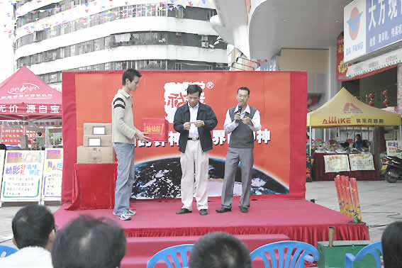 一切准备就绪,梁经理劲步如飞踏上舞台主持有关仪式。