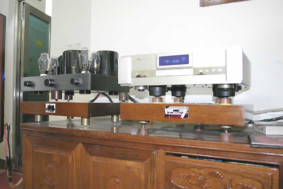 器材都加垫避震措施,黄先生开始时到音响店购置了一些避震脚钉,后来干脆自己按尺寸用黄铜车了一些回来,效果更佳。
