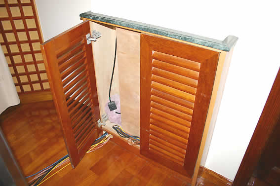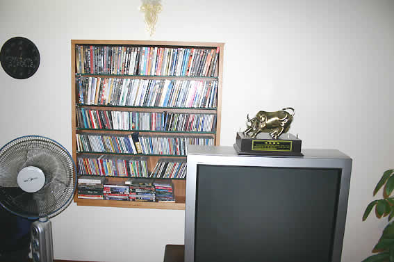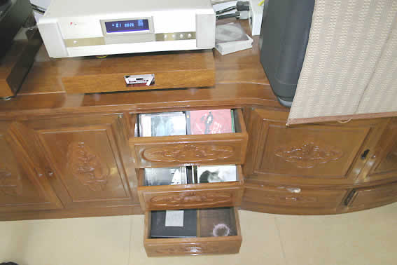 发烧友黄先生的家中音响配置,由于购房时没有考虑到专业的音响室,所以辟小厅的一角作为音响室,干脆就直接放在红木组合柜。器材是300B胆机推一对书架箱。正面的木门原是玻璃,为了靓声所以用木板封了。电视也不能揭起盖头来。